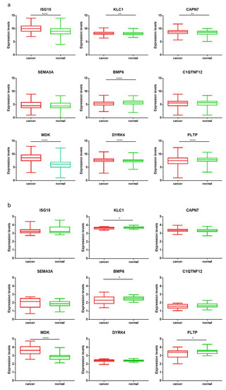 The gene expression of the selected nine HSP-pp was assessed by RNASeq analysis performed on paired HCC samples and matched nontumoral liver tissues from 24 HCC patients (Table S2). The results showed a trend of a higher expression level in cancer tissues for ISG15, CAPN7, SEMA3A, and DYRK4 genes. The MDK gene showed the most relevant increased expression in cancer tissues with a p value < 0.0001. On the contrary, KLC1, BMP6, C1QTNF12, and PLTP genes showed higher expression levels in the normal tissues. In order to confirm such results on a much larger dataset, we took advantage of publicly available data (http://gent2.appex.kr/gent2/ (accessed on 18 March 2021)). Gene expression levels from 691 liver cancer tissues were compared with 297 normal tissues. The analysis confirmed the data generated on the 24 HCC samples of our cohort and was supported by a high statistical p value, except for SEMA3A and C1QTNF12 genes (Figure 3a,b). The gene expression levels showed a significant correlation with the protein expression reported at the Protein Atlas for most of the selected HSP-pp (data not shown).