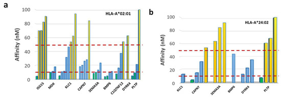 Among the 99 SBs, only those with a predicted affinity lower than 100 nM were selected and further subdivided into three groups, characterized by affinity < 10 nM, 10 < affinity < 50 nM, affinity > 50 nM. Indeed, only those with a predicted affinity <100 nM have been previously shown to have a 100% concordance with ex vivo binding assay [27]. According to such a classification, 36 SBs were selected in both HLA-A alleles, of which 12 peptides with affinity < 10 nM and 24 peptides with 10 < affinity < 50 nM (Figure 4a,b).