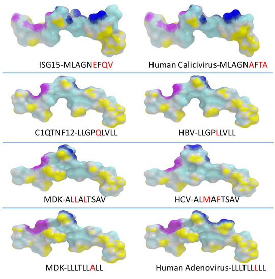 Predicted 3D conformation of paired peptides. The conformation of the TAA peptides and paired viral antigens bound to the HLA-A*02:01 molecule is shown. The prediction was performed using as template structure the HTLV-I LLFGYPVYV peptide crystallized with the HLA-A*0201 molecule, the β2 microglobulin, the α and β chains of the T-cell receptor (TCR) (PDB https://www.rcsb.org/structure/1AO7 (accessed on 14 April 2021)). Yellow areas = contact points with HLA molecule; blue areas = contact points with the TCR α chain; violet areas = contact points with the TCR β chain.
