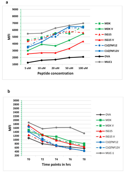 In order to experimentally confirm the binding and stability of peptides to the HLA-A*02:01 molecule, the TAP-deficient HLA-A*02:01-positive T2 cell line was loaded with the individual peptides from each pair. The analysis confirmed that each peptide bound the HLA-A*02:01 molecule induced a dose-dependent increase in the HLA surface expression on T2 cells over the background, as well as the OVA negative control level. The highest level of binding was observed for the paired C1QTNF12 and HBV peptides, characterized by the same MFI. For the other two pairs, the binding of the TAA was clearly stronger than the paired viral epitope. Overall, the binding assay confirmed the high affinity of all peptides to the HLA-A*02:01 molecule as suggested by the prediction analysis (Figure 6a). The peptide–MHC dissociation kinetics showed that the 50% dissociation value (Thalf) was reached 4 h after the peptide loading (T4), for the ISG15 and C1QTNF12 pairs, while it was never reached up to 8 h after the peptide loading (T8) for the MDK pair (Figure 6b). Strikingly, the observed Thalf for each peptide was in agreement with the predicted values.
