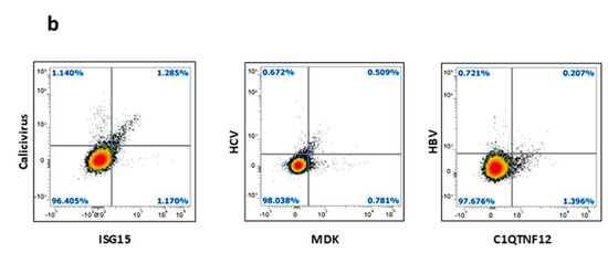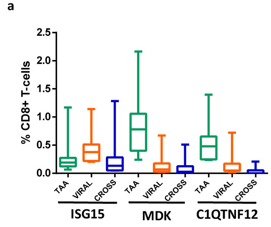 In order to confirm the antigenicity of the predicted peptides, we performed an analysis to detect CD8+ specific T-cell clones in PBMCs from HCC patients and healthy subjects. MHC-class I tetramers for HLA-A*02:01 were loaded with individual peptides from ISG15 (MLAGNEFQV), MDK (ALLALTSAV), and C1QTNF12 (LLGPQLVLL). The results showed the presence of circulating CD8+ T cells specific for all three peptides in both HCC and healthy subjects, although at a significantly different level (Figure 7a; Supplementary Figure S15). In particular, the percentage of CD8+ T cells reacting with the MDK peptide was the highest (average 0.88%), followed by C1QTNF12 (0.55%) and ISG15 (0.32%). In parallel, the T-cell reactivity against the paired viral-derived epitopes showed a different pattern. Indeed, the highest percentage of reactivity was observed for the human calicivirus MLAGNAFTA peptide homologous to ISG15 (average 0.46%), followed by the hepatitis C virus ALMAFTSAV peptide homologous to MDK and the hepatitis B virus LLGPLLVLL peptide homologous to C1QTNF12 (average 0.16%). The T-cell cross-reactivity against the paired epitopes directly reflected the reactivity against the viral-derived epitopes, with the highest percentage of cross-reactive cells against the ISG15 pair (average 0.298%), followed by the MDK pair (average 0.11%) and the C1QTNF12 pair (average 0.04%) (Figure 7a,b).