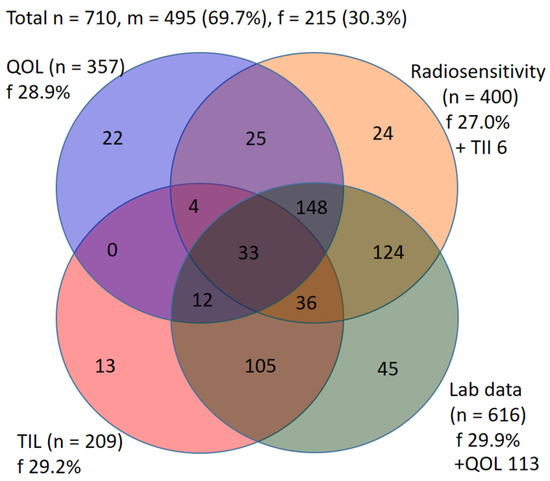 Members of the cohort from four subgroups. The number in the four overlapping circles indicates the number of participants from all four subgroups, corresponding to the three, two and single subgroups. The numbers “+TIL” stand for the intersection of the patient numbers from the radiosensitivity group and the TIL group or “+QOL” for the intersection of the QOL group and the laboratory data group. m = male, f = female, QOL = quality of life cohort, TIL = tumor-infiltrating lymphocytes cohort.