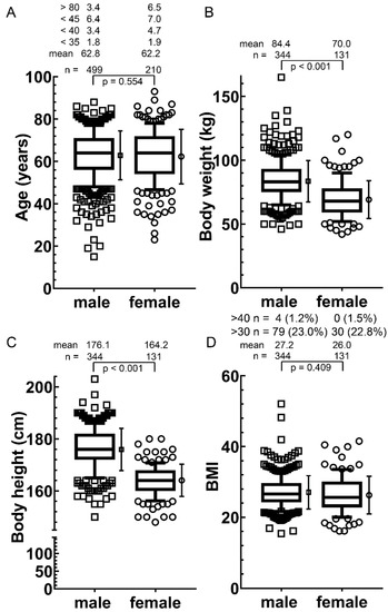 Age, body weight, height and body mass index compared between women and men in the entire cohort. Indicated are the number of individuals: (A) Age; (B) Body weight; (C) Height and (D) Body mass index. The box represents the median, the 25th to 75th percentiles and the whiskers of the 10th to 90th percentiles. The mean and standard deviation are shown to the right of the box; p-values were calculated by the Student’s t-test.