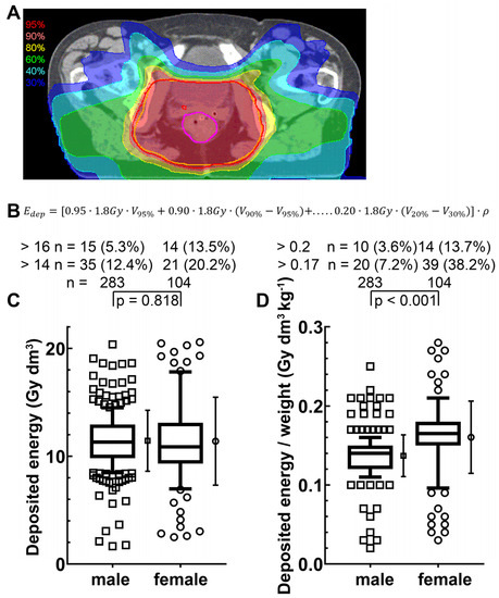 We assessed whether there was a difference in the total deposited energy between males and females. We used the isodose volumes of the radiation planning system and calculated a deposited energy of each patient (Figure 3A). The deposited energy is defined as the sum of the isodose dose values multiplied by the volume of this dose level and the mass density (Figure 3B). Equal amounts of energy were deposited in males and females (Figure 3C). However, taking into account that females have a lower mass, the mean dose related to the total body is significantly higher in females (p < 0.001) (Figure 3D). The 95% isodose volume to treat the tumor, however, tended to be smaller in women than in men (p = 0.088). In terms of body weight, there was no difference, indicating that the tumor region was treated equally in men and women (p = 0.488), as shown in Supplementary Figure S1. Chemotherapy given simultaneously was 5-FU based in males in 90.9% and in females in 85.6% of the cases. The healthy control cohort consisted of 79 men and 108 women with mean ages of 51 years and 49.4 years, respectively.