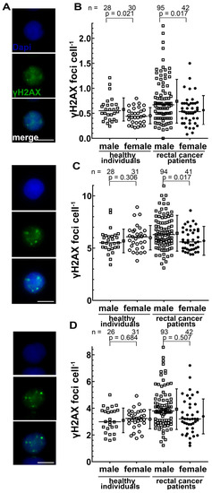 A key question of our analyses was whether a gender difference in the DNA double- strand break (dsb) repair and chromosomal aberrations induction exists. DNA dsb were analyzed by γH2AX staining (Figure 4A) in blood lymphocytes obtained prior to RCT. DNA dsb background rates in men were slightly higher in both healthy individuals (p = 0.021) and patients with rectal cancer (p = 0.017) (Figure 4B). The initial dsbs 30 min after an ex vivo dose of 0.5 Gy ionizing radiation were equal in healthy individuals and slightly higher in males with rectal cancer (Figure 4C). The remaining DNA DSB after a dose of 2 Gy and 24 h of repair time were identical between genders in healthy subjects (p = 0.684) and patients with rectal cancer (p = 0.507) (Figure 4D).