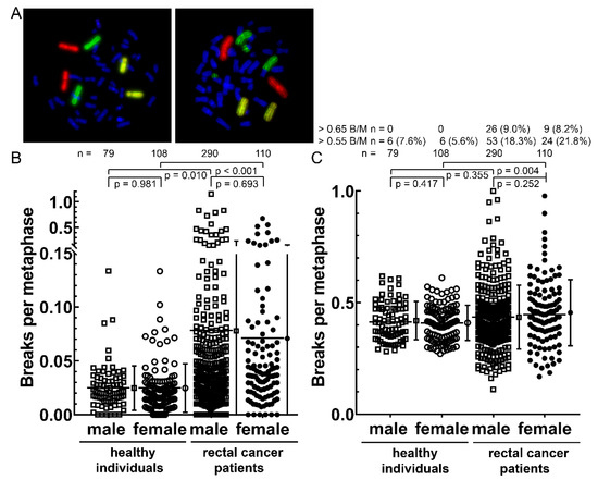 Chromosomal aberrations were analyzed by three color fluorescence in situ hybridization (Figure 5A). Background levels of both genders in rectal cancer patients were clearly higher compared to healthy individuals, yet between genders no difference was observed (Figure 5B). After 2 Gy ex vivo irradiation, there was no difference in between healthy individuals and rectal cancer patients between sexes. The same was observed when only stable or unstable or complex aberrations were compared (Supplementary Figure S2A–C).