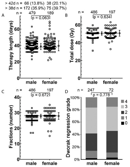 Therapy length, total dose and number of fractions of the entire cohort: (A) Length of therapy in days of 479 men and 189 women; (B) Total dose applied in Gy; (C) Number of fractions irradiated. The line indicates the median; (D) Regression of the cancer cells after RCT of the radiosensitivity cohort. Dworak regression grade means 0 is no regression and 4 is no remaining cancer cells. The mean and standard deviation are shown to the right of the dot plots; p-values were calculated by the Student’s t-test and the Fisher’s exact test were used for regression.