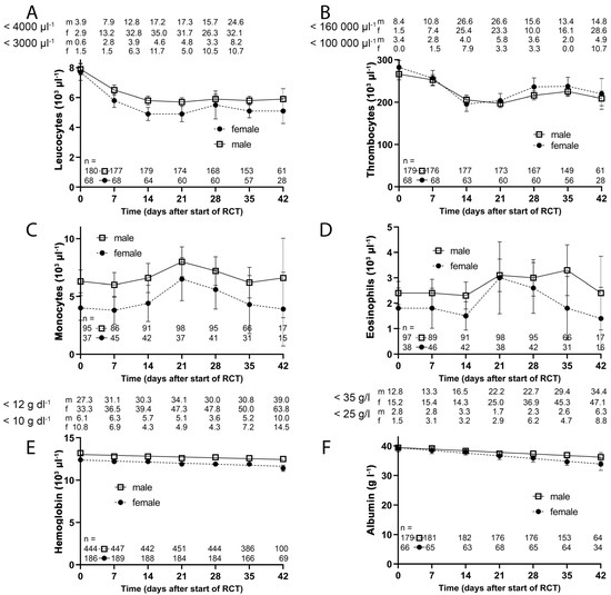 Blood values prior to and during the RCT of the lab data cohort. The filled dots represent women and the open rectangles represent men. The number of people with blood samples is indicated. The number of (A) Leukocytes; (B) Platelets; (C) Monocytes; (D) Eosinophils and the amount of (E) hemoglobin and (F) Albumin were given. Length of the error bars is the 95% confidence interval for the mean. m = male, f = female.