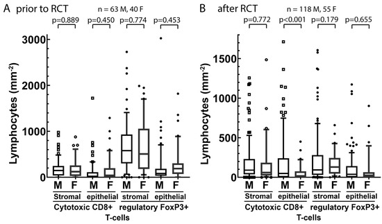 Stromal and intraepithelial cell density distributions of CD8+ and FoxP3+ regulatory T cells from samples (A) prior to RCT and, on average, (B) 55 days after RCT (tumor-infiltrating lymphocytes cohort). The center line represents the median value, while the box indicates the interquartile range (IQR). The whiskers represent 1.5 times the IQR or the minimum/maximum. Outliers are indicated by symbols; p-values were calculated by the Student’s t-test. The box represents the 25th to 75th percentiles and the whiskers represent the 10th to 90th percentiles. M = male, F = female, RCT = radiochemotherapy.