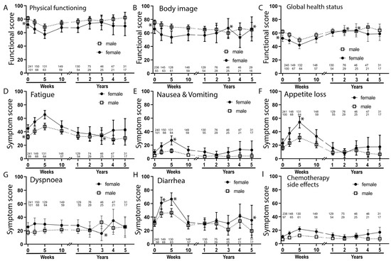 Furthermore, we analyzed quality of life to study therapy-related side effects during therapy and for a long follow-up period of up to 5 years after RCT. The QLQ-C30 and C38 questionnaires were used. In nearly all function and symptom scores, the females’ baselines tended to be worse or were 10% points below the males’ scores and were therefore regarded as significantly inferior. During RCT, females tend to deteriorate more than males in several scores. This was most pronounced for nausea and vomiting, appetite loss and diarrhea (Figure 9). However, already ten weeks after the beginning of RCT, most symptoms returned to baseline. One year after beginning the RCT or later, there was even an improvement in the state of women compared to men of 10% or more with regard to body image, fatigue, dyspnea and diarrhea. This was true for most of the other functional scores (Supplementary Figures S6–S9).