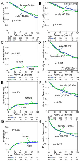 Finally, we analyzed the difference in survival between men and women. We found no differences in overall survival (p = 0.596), tumor-specific survival (p = 0.199), local recurrence free survival (p = 0.621), distant metastasis free survival (p = 0.306) or progression- free survival (p = 0.423) (Figure 10). Cumulative incidence of local recurrence (p = 0.375), metastatic disease (p = 0.804) and progression (p = 0.657) was not different between men and women.