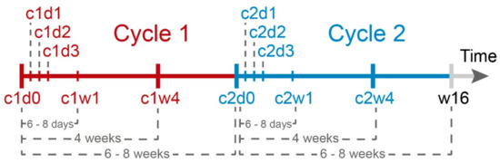 Radiosynthesis of the radioligand PSMA-617 was performed as previously described [20], with slight modifications, including the use of n.c.a. [177Lu]LuCl3, ammonium acetate buffer and 67-nmol DOTA-PSMA-617 (ABX advanced biochemical compounds, D-01454 Radeberg, Germany). Two cycles of PSMA-RLT (at 6 GBq (162.16 mCi) per cycle) were administered six to eight weeks apart, followed by biochemical (PSA) and PSMA PET/CT-based restaging six to eight weeks later (i.e., 16 weeks after first administration). Subsequently, following in-house standards, patients who showed no obvious signs of progression (clinically or on PET/CT) or high-grade toxicity received further cycles of RLT, while patients with clinical and/or imaging-based progression were offered the best standard of care treatment. To assure consistency and comparability, prospective PSA assessment in this study was therefore confined to the first two treatment cycles up to restaging. For each cycle (c1, c2), serum PSA (Total PSA: Elecsys® total PSA, Roche Diagnostics GmbH, D-79639 Grenzach-Wyhlen, Germany) was determined at our facility during the 3- to 4-day hospitalization period immediately before administration (d0), as well as 24 (d1), 48 (d2) and 72 (d3) hours later; during ambulatory visits the following week (i.e., 4–7 days after administration, w1); during follow-up examination four weeks after administration (w4) and at the restaging after two cycles (w16). See Figure 1 for the study timeline and naming conventions.