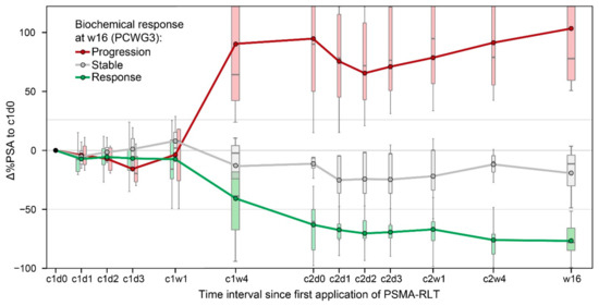 Percental change in PSA (Δ%PSA) one day (c1d1), two days (c1d2), three days (c1d3), one week (c1w4) and at restaging 16 weeks (w16) after first administration (c1d0) of 177Lu-labelled radioligand therapy (PSMA-RLT), categorized by the biochemical response at w16 following PCWG3 criteria. Response: PSA decrease of at least 50%, Stable: PSA decrease smaller than 50% or PSA increase smaller than 25% and Progression: PSA increase of at least 25%. Mean values (open circles), and box plots are given for each time point.