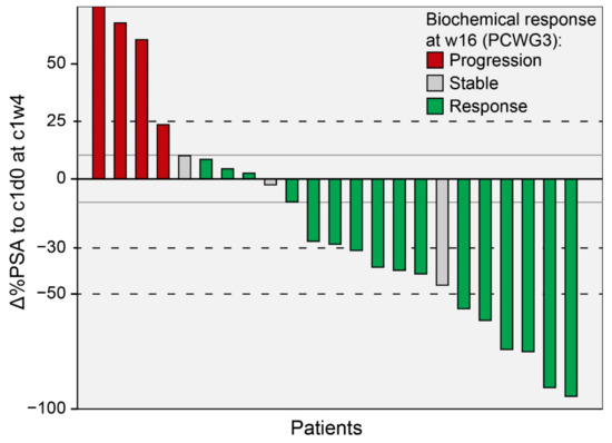 At c1w4, PSA thresholds of ∆%PSAc1w4 ≥ 25% and ∆%PSAc1w4 ≤ −30% were significant and strong predictors for biochemical progression (χ2(4) = 16.39 p < 0.001, n = 23; Cramer-V = 0.844) and the response at w16 (χ2(4) = 4.54, p = 0.033, n = 23; Cramer-V = 0.44), respectively. At that time point, ∆%PSAc1w4 ≥ 25% showed a sensitivity of 75% (3/4) and specificity of 100% (19/19) for biochemical progression, while ∆%PSAc1w4 ≤ −30% offered a sensitivity of 63% (10/16) and a specificity of 86% (6/7) for the biochemical response. The respective contingency table and waterfall plot comparing the two time points (c1w4 and w16) are given in Table 2 and Figure 3, respectively.