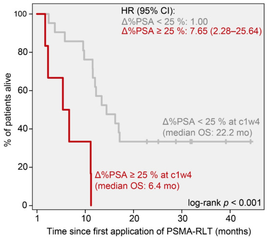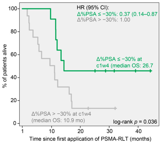 Kaplan–Meier curves for the OS of patients stratified by a PSA decrease of at least 30% (Δ%PSA ≤ −30%) at four weeks (c1w4). Median OS and hazard ratios (HR) with 95% confidence interval (95% CI) are given for each group.