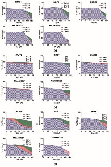 Dose- and time-dependent effects of n6- or n3-fatty acids on the growth of five subtype human breast cancer cells (BT474, MCF7, SKBR3, MDAMB231, and MDAMB468) graphed using the area under the curve (AUC) as a percent of the untreated control. (a) Linoleic acid (LA, n6); (b) Eicosapentaenoic acid (EPA, n3); (c) Docosahexaenoic acid (DHA, n3).