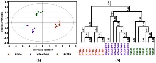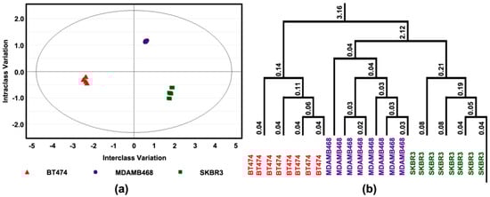In addition, the same approach as described above was used to determine if these differences were sufficient to distinguish among cell lines; complete separation was observed (Figure 4a). The response was most distinctive in BT474 (triple positive) and the responses of MDAMB468 (triple-negative) and SKBR3 were more like one another (Figure 4b).