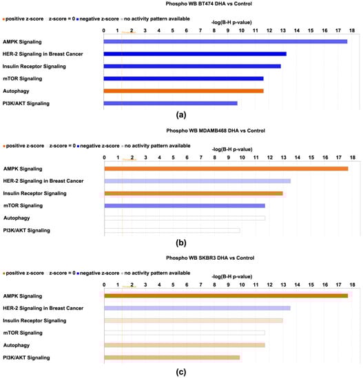 Canonical pathways affected by 4-oxo-DHA as predicted by the phosphoproteome data sets listed in Table 1, Table 2, Table 3 and Table 4. Canonical pathways shown for cell line (a) BT474, (b) MDAMB468, and (c) SKBR3. The −log(B-H p-values) is the multi = comparison-adjusted probability that the association between the protein expression set and the canonical pathway is due to chance. The direction of the differences in expression between the treatment and the control for each protein component was compared to that tabulated in the IPA knowledge basis (>80,000 database entries) that support the canonical pathways that have been annotated and a z-score was computed. A z-score ≤ −2 indicates the pathway is inhibited and ≥2 that the pathway is activated. If the z-score is between −2 and 2, no prediction of inhibition or activation is deduced. Shades of red indicate that the pathway was activated by treatment with 4-oxo-DHA; greater color intensity indicates stronger evidence of activation. Shades of blue indicate that the pathway was inhibited by treatment with 4-oxo-DHA; greater color intensity indicates stronger evidence of inhibition. The absence of coloration indicates that the evidence was not strong enough to permit a prediction of pathway status.