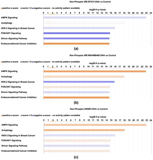 All protein expression data, i.e., both phosphorylated and non-phosphorylated, were subjected to log2-fold change computational analysis (4-oxo-DHA vs. control) and statistical analysis with false discovery rate (FDR) correction. Those data were evaluated using the IPA Core Analysis algorithm. The components of the protein expression panel were matched for their overlap with the >250 canonical pathways that are annotated in IPA using a Fisher Exact Test with FDR (B-H) correction for multiple comparisons. The smaller the p-value, the lower the probability that the association between the protein expression set and the canonical pathway is due to chance. In addition, the direction of the differences in expression between the treatment and the control (magnitude and direction) for each protein component was compared to that tabulated in the IPA knowledge basis (>80,000 database entries) that support the canonical pathways that have been annotated and a z-score was computed. A z-score ≤ 2 indicates the pathway is inhibited and ≥2 that the pathway is activated. If the z-score is between −2 and 2, no prediction of inhibition or activation is deduced. The results of the analysis are shown in Figure 6 and Figure 7 and Figure S3. The top 6 canonical pathways identified using the phospho-proteome data are shown (Figure 6) in addition to the top 6 pathways identified using the non-phosphorylated protein expression analysis (Figure 7).