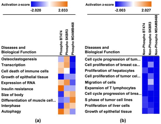 The Core Analysis algorithm in IPA also identifies diseases and functions within cells that are consistent with the protein expression data. Those data are shown in heat maps based on the expression of non-phosphorylated and phosphorylated proteins (Figure 8). This data is also detailed in Table S2.