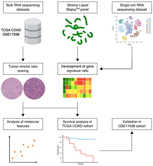 Simplified schematic workflow of the study. Bulk and single-cell RNA sequencing data were collected from public repositories. Constituents of the Stroma Liquid Biopsy panel were used to develop a stromal-epithelial gene signature ratio based on single-cell gene expression of intratumoral cell populations. The histologic tumor-stroma ratio was used to quantify intratumoral stromal content in pathology slides from the TCGA COAD cohort. Subsequently, the gene signature ratio was studied in histologic stroma-high and stroma-low tumors. In addition, the association between the gene signature ratio and established molecular tumor characteristics, such as microsatellite instability and the consensus molecular subtypes, was assessed. Lastly, the prognostic performance of the gene signature ratio was tested in the TCGA COAD discovery cohort and validated in the GSE17358 cohort.