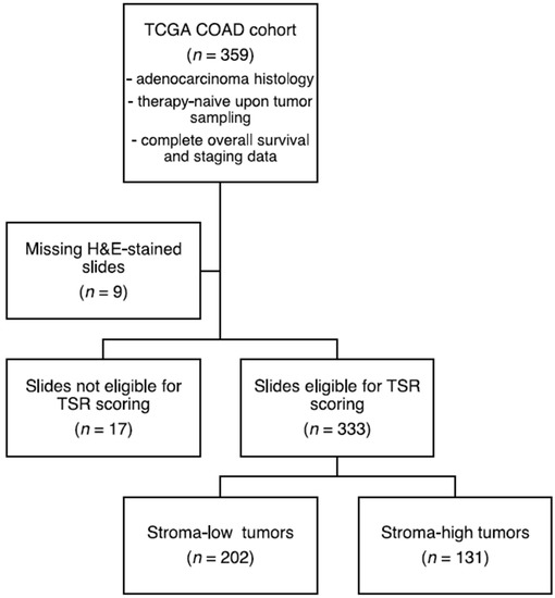 For TSR scoring, diagnostic Hematoxylin and Eosin (H&E)-stained slides of primary tumors from the TCGA COAD project were downloaded through the GDC portal. Using Aperio Imagescope (version 12.4.3) digital slide viewer software, the visual field with the highest amount of stroma was selected, according to the previously published protocol [35]. The percentage of stroma was scored in increments per ten percent and the tumors were subsequently categorized as stroma-high (>50% stroma) or stroma-low (≤50% stroma) using the standardized cut-off value of 50% [3]. To ensure proper TSR scoring, the observers (C.R. and M.P.) were trained with the TSR E-learning module constructed for the Uniform Noting for International Application of the Tumor-Stroma Ratio as an Easy Diagnostic Tool (UNITED) study [36,37]. In 33% percent of the slides, blinded visual scoring was performed by a second observer (M.P.) and subsequently, the interobserver agreement was assessed by Cohen’s kappa coefficient. If consensus could not be reached, scoring by a third observer (S.C., board-certified pathologist) was decisive. The scored stromal percentages are publicly available in Supplementary Data S1.