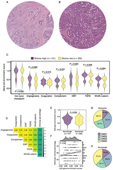 Gene enrichment analysis of stromal pathways and its association to histologically scored stromal percentage. Illustrative images of (A) stroma-high and (B) stroma-low tumors as scored by the TSR. (C) Gene enrichment scores of 6 notable stromal pathways for stroma-high and stroma-low tumors. (D) Correlation matrix of stromal pathway gene enrichment scores and histologic stromal percentage. (E) Enrichment score of the Stromal Liquid Biopsy gene set in stroma-high and stroma-low tumors. (F) Correlation plot of Stromal Liquid Biopsy gene enrichment score and histologic stromal percentage. (G) Distribution of consensus molecular subtype (CMS) in histologic stroma-low tumors. (H) Distribution of CMS in histologic stroma-high tumors. EMT, epithelial-to-mesenchymal transition; SLB, Stromal Liquid Biopsy; ρ, Spearman’s rho.
