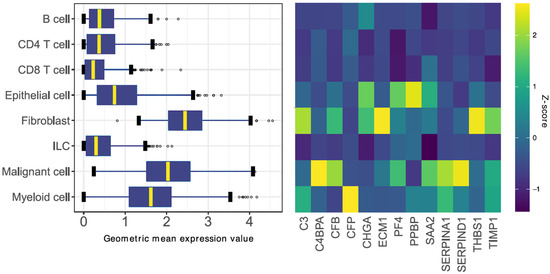 To account for intratumoral cellular heterogeneity, we aimed to evaluate the expression of the SLB panel gene set in distinct cell populations within the tumor. The expression of the SLB genes was studied in a scRNA sequencing dataset of CRC tumors, previously reported by Zhang et al. [34]. We noticed a higher expression of the gene set in cells of epithelial- (i.e., colon epithelial and malignant cells), mesenchymal- (i.e., fibroblast), and myeloid-origin, as compared to lymphoid-derived cell types (Figure 4, left panel). Upon closer inspection, gene expression patterns related to epithelial-phenotypic cells and stroma-related cells were detected (Figure 4, right panel). Subsequently, we created two gene signatures using the expression Z-score of >1.5 as a cut-off for gene inclusion into the signatures (Supplementary Data S2); the stromal signature was composed of genes with relatively high expression in fibroblasts and myeloid cell types (C3, CFP, ECM1, THBS1, and TIMP1), whereas the epithelial signature was composed of genes with high expression in epithelial and malignant cell types (C4BPA, CFB, CHGA, PF4, PPBP, SAA2, SERPINA1, and SERPIND1).