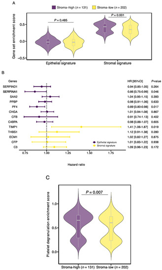 Next, we tested the contribution of the individual genes on patient OS (Figure 5B). A total of 3 of the 13 genes demonstrated a significant effect on survival. Expression of TIMP1, a constituent of the stromal signature, was associated with an increased risk of death (HR 1.405, 95%CI 1.058–1.866, p = 0.019). Conversely, expression of PF4 (HR 0.887, 95%CI 0.803–0.979, p = 0.017) and SERPINA1 (HR 0.863, 95%CI 0.747–0.997, p = 0.046), genes from the epithelial signature, was associated with decreased risk of death. Based on the earlier conducted functional enrichment analysis, we noticed that TIMP1, PF4 and SERPINA1 share a role in platelet degranulation, suggesting a key role for this biological process in colon cancer survival. Interestingly, when we performed gene set enrichment analysis of the curated platelet degranulation gene set, we observed increased enrichment scores in the histologic stroma-high tumors in comparison to the stroma-low tumors (median 0.654 vs. 0.605, p = 0.007; Figure 5C).