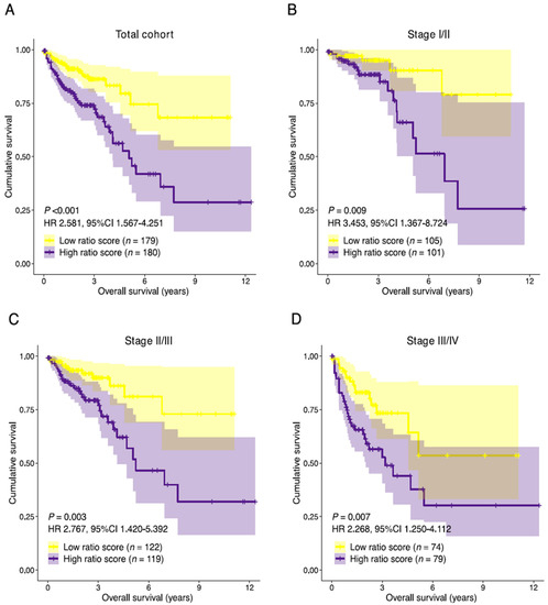 Prognostic performance of the stromal-epithelial signature ratio. Kaplan-Meier curves of the overall survival for the stromal-epithelial ratio-risk scores in (A) the total cohort (n = 359), (B) stage I/II (n = 206), (C) stage II/III (n = 241), and (D) stage III/IV (n = 153) subpopulations. Patients with a high ratio-risk score, categorized by the 50th percentile (median) cut-off, demonstrated a shorter overall survival time. HR, hazard ratio; CI, confidence interval.