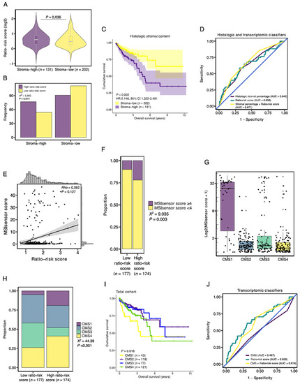 Association of the stromal-epithelial signature ratio with established histologic and molecular tumor characteristics. (A) Median ratio-risk score for the stroma-high and stroma-low populations as categorized by the TSR. (B) Frequency barplot for high and low ratio-risk scores stratified by the TSR. (C) Kaplan-Meier curve of the overall survival for the histologic stroma-high and stroma-low tumors. (D) Prognostic performance of histologic intratumoral stromal percentage and the ratio-risk scores. (E) Correlation between the continuous MSIsensor scores and ratio-risk scores. (F) Proportion of MSIsensor scores in the high and low-ratio risk score tumors. (G) MSIsensor scores and consensus molecular subtypes (CMS). (H) Proportion of consensus molecular subtypes (CMS) in the high and low-ratio risk score tumors. (I) Kaplan-Meier curve of the overall survival for the CMS. (J) Prognostic performance of the CMS and the ratio-risk scores. AUC, area under the curve; X2, Pearson Chi-Square; Rho, Spearman’s rho.