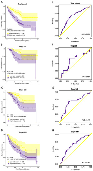 Validation of the prognostic performance of the stromal-epithelial signature ratio in an external cohort. Kaplan-Meier curves of the overall survival time for the stromal-epithelial ratio-risk scores in (A) the total cohort (n = 229), (B) stage I/II (n = 98), (C) stage II/III (n = 146), and (D) stage III/IV (n = 131) subpopulations. Patients with a high ratio-risk score, categorized by the 50th percentile (median) cut-off, demonstrated a shorter overall survival time. Corresponding area under the receiver operating characteristic curve (AUC) of the stromal-epithelial signature ratio for (E) the total cohort, (F) stage I/II, (G) stage II/III, and (H) stage III/IV subpopulations. HR, hazard ratio.