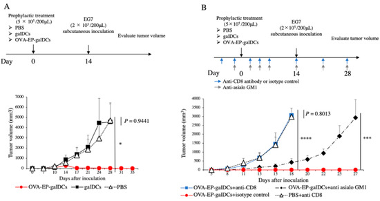 3.2. OVA-EP-galDC Vaccine Promoted Complete Rejection of Subcutaneous Tumors in a Manner Dependent on CD8+ T Cells in Prophylactic Models