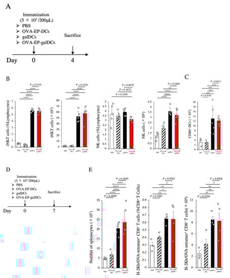 3.4. OVA-EP-galDC Vaccine Induced iNKT Cells, NK Cells, and DCs in the Spleen