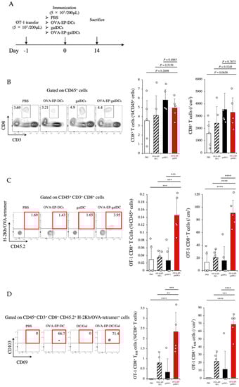 3.7. OVA-EP-galDC Vaccine Induced OT-1 CD8+ Tissue-Resident Memory T Cells (TRM Cells) in the Skin