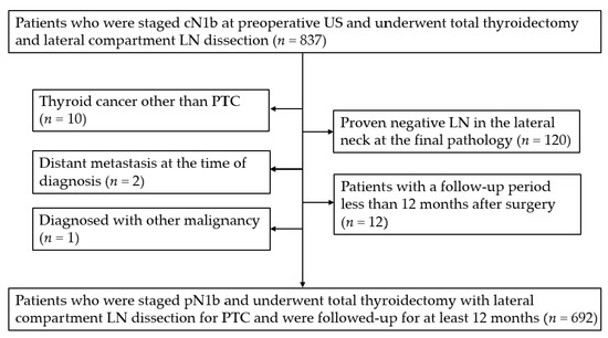 This retrospective study was approved by our Institutional Review Board and informed consent was waived. A total of 837 patients were staged N1b on preoperative US between January 2009 and December 2015 and underwent total thyroidectomy and lateral compartment LN dissection. Among them, 145 patients were excluded as follows: (a) 120 patients with proven negative LN in the lateral neck at the final diagnosis; (b) 10 patients with thyroid cancer other than PTC; (c) two patients with metastasis in other organs at the time of diagnosis; (d) one patient with other malignancy; and (e) 12 patients with a follow-up period less than 12 months after surgery. Finally, we included a total of 692 patients consisting of 464 females (mean age, 41.3 years; range, 9 to 80 years) and 228 males (median age, 43.1 years; range, 6 to 79 years) (Figure 1).