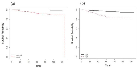Patients with hyperechoic LNs showed lower 5- and 10-year RFS than patients with iso- or hypoechoic LNs (5-year RFS, 94.6% vs. 99.6%; 10-year RFS, 88.9% vs. 97.9%; both p < 0.0001). In addition, patients with LNs larger than 20 mm showed lower 5-year RFS than patients with LNs 20 mm or less (5-year RFS, 87.9% vs. 98.2%; 10-year RFS, 83.3% vs. 94.4%; both p < 0.0001) (Figure 2 and Figure 3).