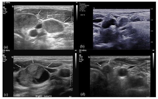 - Rosário, P.W.; de Faria, S.; Bicalho, L.; Alves, M.F.; Borges, M.A.; Purisch, S.; Padrão, E.L.; Rezende, L.L.; Barroso, A.L. Ultrasonographic differentiation between metastatic and benign lymph nodes in patients with papillary thyroid carcinoma. J. Ultrasound Med. 2005, 24, 1385–1389. [Google Scholar] [CrossRef] [PubMed]