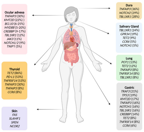 Recurrently mutated genes in MALT lymphoma according to site of origin. Created with BioRender.com.