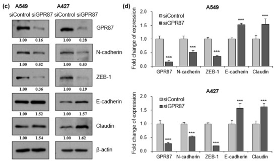 GPR87 regulates expression of EMT markers and EMT-inducing transcription factor. (a) Western blot of N-cadherin, ZEB-1, E-cadherin, and claudin expression in A549 and A427 cells transfected with empty control or GPR87-overexpressing vector. (b) Relative expression of protein levels shown in (a), normalized to β-actin. (c) Western blot of N-cadherin, ZEB-1, E-cadherin, and claudin expression in A549 and A427 cells transfected with sicontrol or siGPR87. (d) Relative expression of protein levels shown in (c), normalized to β-actin. Values represent mean ± standard deviation (SD) from three independent experiments. *** p < 0.001 vs. control.