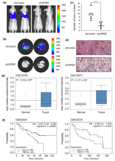 To evaluate the clinical effect of GPR87 silencing on lung metastasis, we used an in vivo tumor model. GPR87-silenced A549-FLuc lung adenocarcinoma cells were intravenously injected into the tail veins of nude mice, and the luminescence signal was visualized once a week. As shown in Figure 5a,b, mice injected with GPR87-silenced cells exhibited significantly suppressed adenocarcinoma cell metastasis in the lung. Downregulation of GPR87 decreased the number of metastatic nodules in mice lungs (Figure 5c). In addition, hematoxylin and eosin (H&E) staining analysis was performed in lung tissues (Figure 5d). These results indicate that GPR87 depletion suppresses the metastatic properties of lung adenocarcinoma cells. To investigate the clinical relevance of GPR87 expression in lung adenocarcinoma patients, we analyzed public microarray lung adenocarcinoma datasets from the NCBI Gene Expression Omnibus (GEO) database. Two datasets for lung adenocarcinomas, GSE19188 and GSE10072, were used in this study. We compared the expression of GPR87 in normal and tumor lung tissues and found that the expression was significantly upregulated in the tumor tissues in both of the datasets (p = 2.42 × 10−6 for GSE19188 and p = 3.17 × 10−9 for GSE10072, t-test, Figure 5e). Using the Kaplan-Meier survival analysis, we examined the association between GPR87 expression and survival outcomes of patients with lung adenocarcinoma. Overall survival was remarkably shorter in patients with high GPR87 expression than in those with low GPR87 expression (p = 8.7 × 10−3 for GSE50081 and p = 2.2 × 10−2 for GSE30219, t-test, Figure 5f). These findings suggest that GPR87 overexpression is associated with cancer progression and poor prognosis in patients with lung adenocarcinoma.