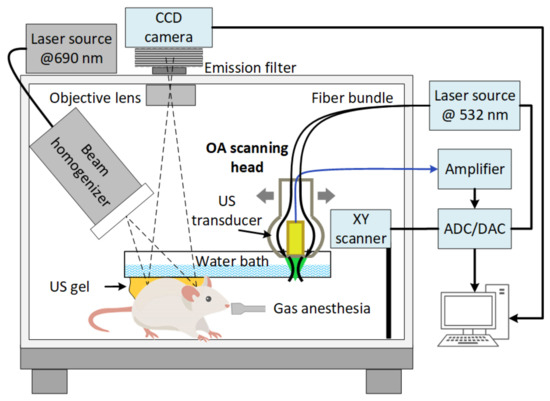 - Subochev, P. Cost-effective imaging of optoacoustic pressure, ultrasonic scattering, and optical diffuse reflectance with improved resolution and speed. Opt. Lett. 2016, 41, 1006–1009. [Google Scholar] [CrossRef]