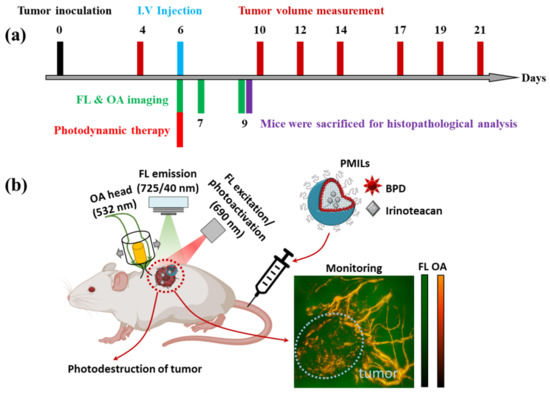 (a) Sequence of CT26 tumor implantation, FL and OA imaging, treatment with PAL, L-[IRI], or PMIL, (b) Schematic representation of the mechanism of action of photoactivatable multi-inhibitor liposomes (PMILs) following photoactivation. The photosensitizer tumoral uptake can be monitored with FL imaging, while the photodestruction of the tumor blood vessels can be monitored with OA imaging.