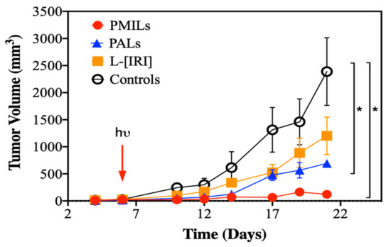 Figure 3 shows the CT26 tumor growth dynamics between days 4 to 21 after tumor inoculation. During the investigation period, the volume of untreated tumors increased from 14.4 ± 1.9 mm3 to 2390 ± 880 mm3. At the end of the monitoring period on the 21st-day post tumor inoculation, the tumor volumes were 1200 ± 600 mm3 for the L-[IRI] group, 460 ± 330 mm3 for the PALs group, and 60 ± 60 mm3 for the PMILs group. A statistically significant difference between treated and untreated animals on the 21st day was revealed for PALs (p = 0.03) and PMILs groups (p < 0.01). The PMILs group demonstrated a higher tumor inhibition effect in comparison to L-[IRI] and PALs. On day 21, the tumor growth inhibition index was 97% for the PMILs group, 81% for the PALs group, and only 50% for the L-[IRI] group.