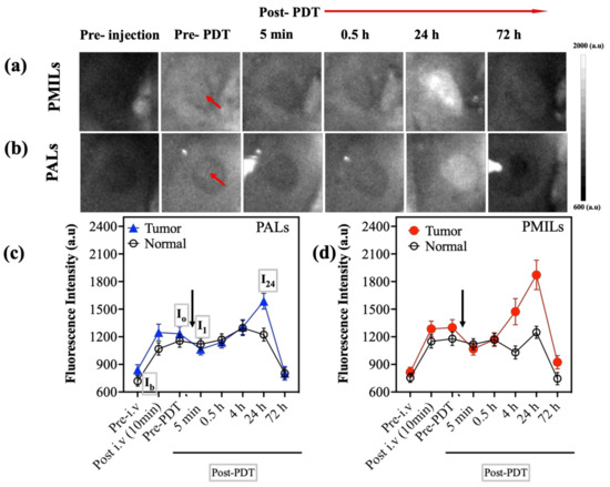 FL monitoring of PDT. Representative fluorescence images were obtained at different time points for mice from PMILs (a) and PALs (b) groups. Red arrows show the tumor nodes. Dynamics of fluorescence signals in tumor (blue and red curves) and surrounding normal tissues (black curves) calculated for a mouse from PALs (c) group and PMILs group (d). Black arrows correspond to the start of light exposure. Mean ± SD.