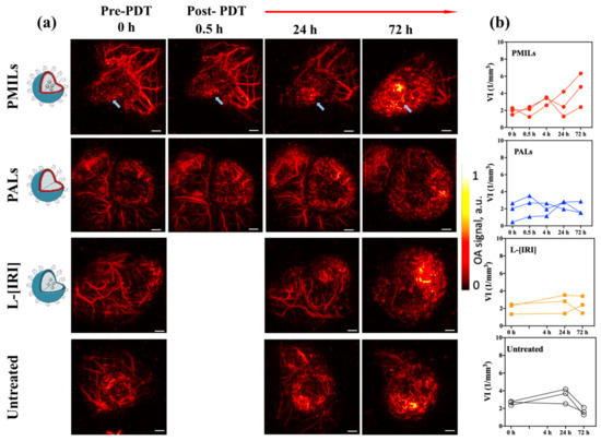In conclusion, the PMILs provided light-triggered bimodal anticancer treatment by simultaneously delivering photosensitizer for PDT and chemotherapy. A new approach of combined OA and FL monitoring for non-invasive in vivo real-time tracing of photosensitizer kinetics and functional vascular effects in the treated area was demonstrated employing the PMILs. The vesselness index based on skeletonization of the reconstructed vessel net, obtained by OA imaging, was employed to quantify the vascular response to the treatment. The largest increase in the vesselness index occurred in tumors with PMILs administration and was in good agreement with the histological data that showed that the strongest therapeutic effect manifested by the percentage of hemorrhages in the PMILs treated mice as compared to PALs or L-[IRI] treated mice. Here BPD and IRI were utilized as two agents encapsulated in PDT, however, the PMILs platform is adaptable for delivering other photosensitizers and chemotherapy agents. It can be concluded that the newly developed system allows for an immediate evaluation of the response to treatment, warranting further studies in different tumor mouse models. Overall, these results suggest that simultaneous bimodal anticancer therapy employing PMILs (combination of PDT with chemotherapy), and treatment monitoring is an efficient way to improve cancer theranostics outcomes.