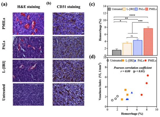 Statistically significant differences in the percentage of hemorrhages in the tumor were observed between groups of untreated and treated animals (p < 0.01 for PALs group, p = 0.02 for L-[IRI] group, p < 0.01 for PMILs group) and between different groups of treatment (p < 0.01 between PMILs and PALs, as well as between PMILS and L-[IRI]). Quantification of H&E-stained images was in good agreement with OA data, i.e., a strong positive correlation (r = 0.80, p < 0.01) was revealed between the values of hemorrhage area and vesselness index (Figure 6d). The results of IHC analysis demonstrated a comparable amount of endothelial marker CD31 in all groups suggesting that the effect observed by OA primarily originates from the appearance of numerous hemorrhages formed post-treatment and is not governed by the newly developed vessels.