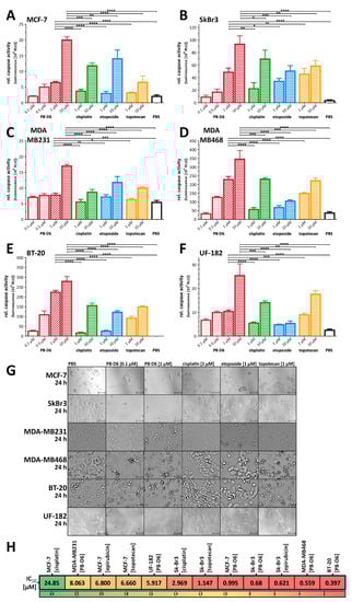Antitumor responses in BC 2D monolayers. MCF-7, SkBr3, MDA-MB231, MDA-MB468, BT-20 (cell line) and UF-182 (primary cells) were treated with P8-D6, cisplatin, etoposide, topotecan and PBS as control. The relative caspase activity representing the rate of apoptosis were measured 48 h after treatment in MCF-7 (A), SkBr3 (B), MDA-MB231 (C), MDA-MB468 (D), BT-20 (E) and UF-182 (F) cells. Additionally, the anti-proliferative effects in the cells were visualized by microscopy after 24 h treatment. Scale bars, 50 µm (G). Heat map presents the IC50 values calculated by viability (H). P8-D6 was compared to cisplatin, epirubicin and topotecan. Data are means + SD one-way ANOVA, * (p < 0.05), ** (p < 0.01), *** (p < 0.001), **** (p < 0.0001), ns (non-significant).