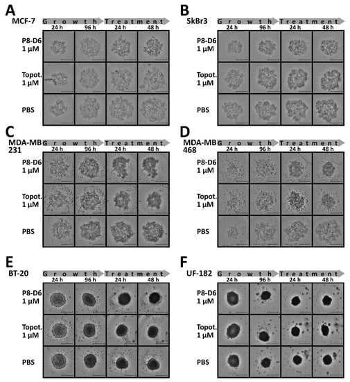 Growth changes in BC spheroids. For 3D culture, MCF-7, SkBr3, MDA-MB231, MDA-MB468, BT-20 (cell line) and UF-182 (primary cells) cells were cultured in ULA plates for 96 h. Subsequently, spheroids were treated with P8-D6 (10 µM, 1 µM, 0.5 µM, 0.1 µM), topotecan (10 µM, 1 µM) and PBS for 48 h. For the monitoring of growth changes and morphological changes, spheroids were imaged every 24 h by microscopy. MCF-7 (A), SkBr3 (B), MDA-MB231 (C), MDA-MB468 (D), BT-20 (E) and UF-182 (F). Scale bars, 500 µm.