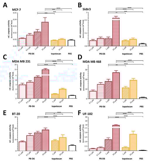 Apoptosis induction in BC spheroids. For 3D culture, MCF-7, SkBr3, MDA-MB231, MDA-MB468, BT-20 (cell line) and UF-182 (primary cells) cells were cultured in ULA plates for 96 h. Subsequently, spheroids were treated with P8-D6 (10 µM, 1 µM, 0.5 µM, 0.1 µM), topotecan (10 µM, 1 µM) and PBS for 48 h. After treatment, the viability and caspase activity were analyzed in MCF-7 (A), SkBr3 (B), MDA-MB231 (C), MDA-MB468 (D), BT-20 (E) and UF-182 (F) spheroids. Data are means + SD (n = 3) one-way ANOVA, * (p < 0.05), ** (p < 0.01), *** (p < 0.001), **** (p < 0.0001), ns (non-significant).